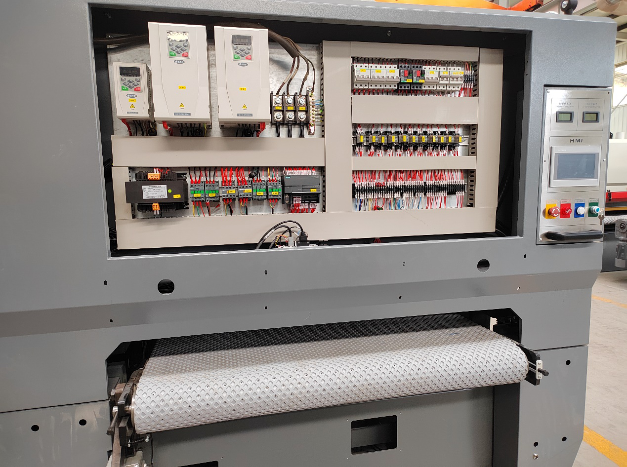 采用尊龙凯时 ENA100系列变频器,控制砂带旋转速度和送料速度的自动化砂光机,可实现无级变速,降低人力需求、增进产能。送料电机配有一个编码器用于计算加工量及工件位置。砂架、砂头的数量可根据实际需求增减,由PLC程序控制多台变频器驱动砂带电机运行,顺利获得无极调速功能,满足各种材质的加工需求。砂光机设备可根据加工量增加而启动气阀,进行自动进给补偿,保证砂头不会因磨轮的磨损而改变砂削效果,保证成品的规格统一。
